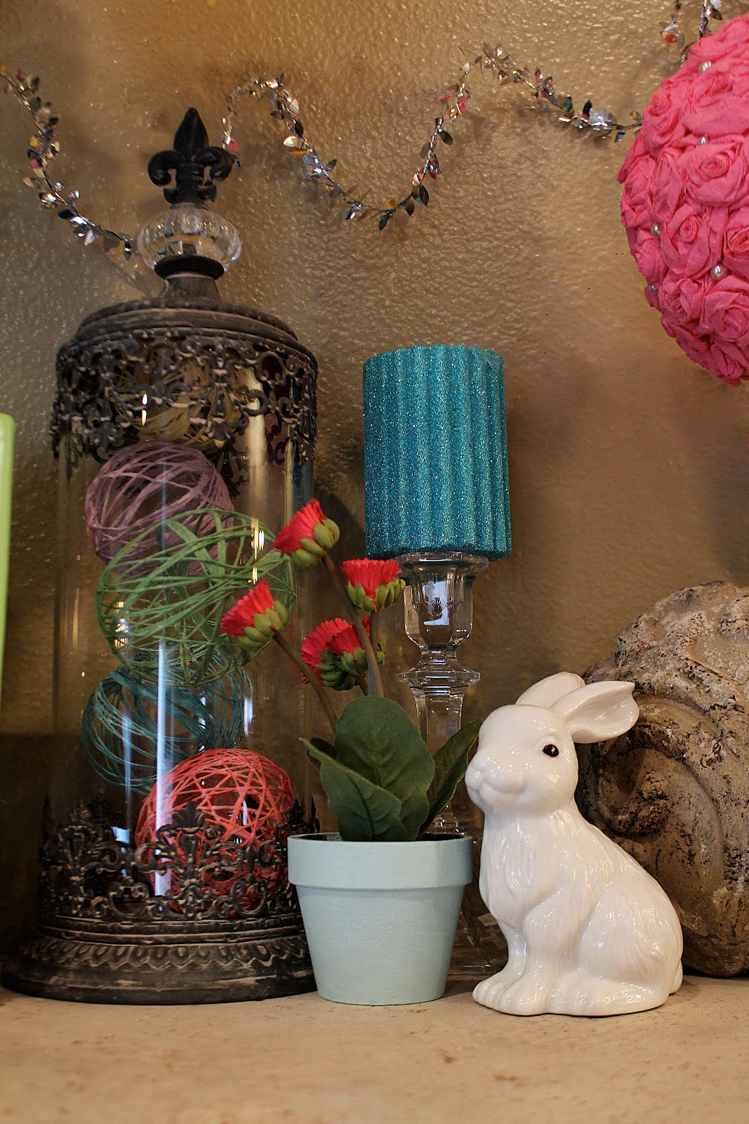 The decorative glass cylinder with the fleur de lis on top I bought at Roberts for $7 dollars and a friend and I made the yarn eggs inside of it. Again the teal pot with flowers in it was .50 cents at D.I., the bunny was .50 cents form a garage sale and the crystal candle holder and candle were a total of $2 from D.I. also.